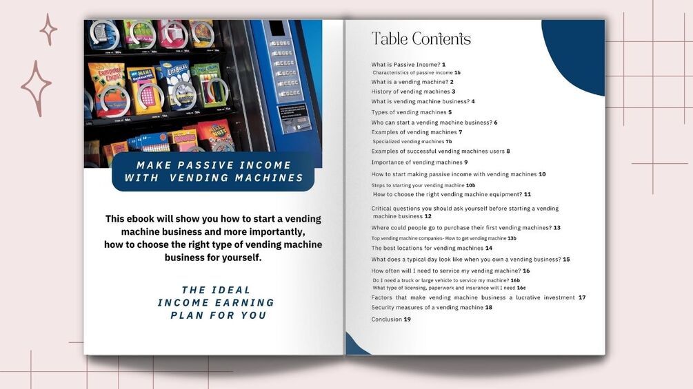 Learn how to create a successful vending machine business in this eBook, and more significantly, how to pick the right kind of vending machine for your enterprise. The Amounts of Passive Income Are Unlimited.